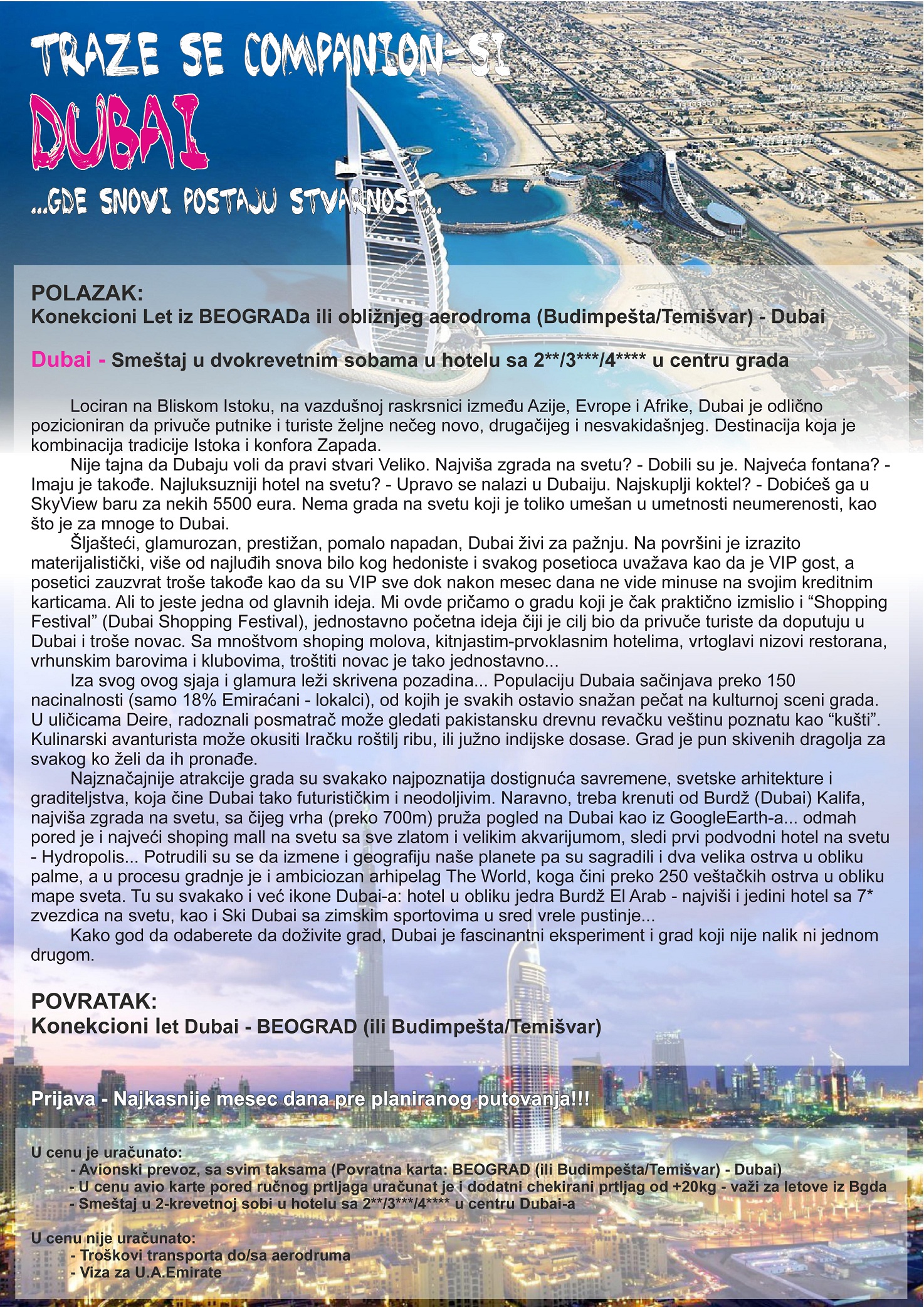 * moguća doplata za noćenje u najluksuznijem hotelu na svetu Burj Al Arab +1030€ za jednu noć za dve osobe ukupno